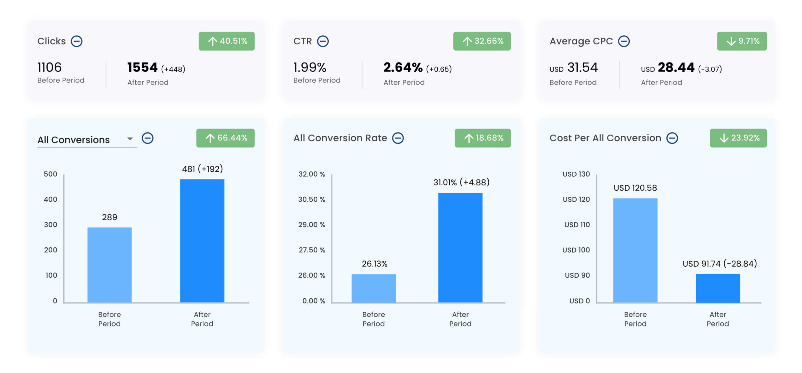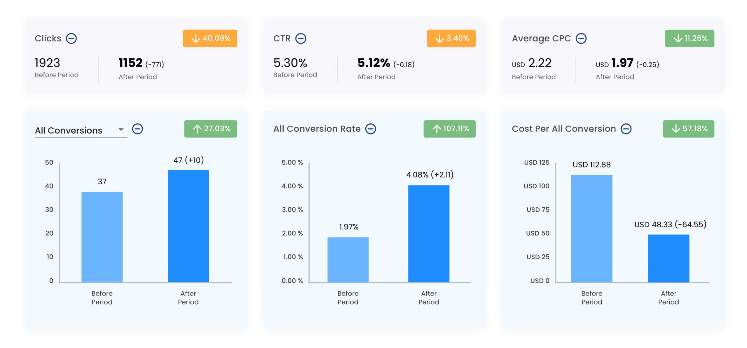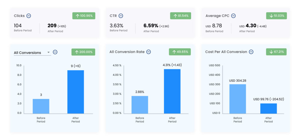 Wenn wir die Daten zum ersten Mal in Ihr Google Ads-Konto „pushen“, werden Sie innerhalb von 7 Tagen feststellen, dass sich die Suchanfrageaktivität ändert. Das ist zwar von Konto zu Konto unterschiedlich, aber zu den von uns beobachteten Veränderungen gehören erhöhte Klickraten (CTRs), eine Senkung der durchschnittlichen Cost Per Acquisition (CPA), eine Erhöhung der Konversionsraten und mehr.