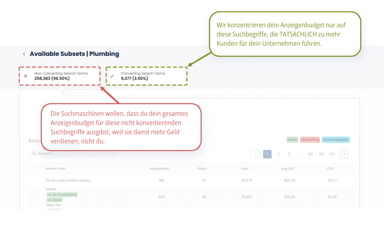 Wir verfügen über 109 Millionen analysierte Suchbegriffe, sodass wir mit statistischer Sicherheit wissen, welche Suchbegriffe in neue Kunden umgewandelt werden und welche nicht.
